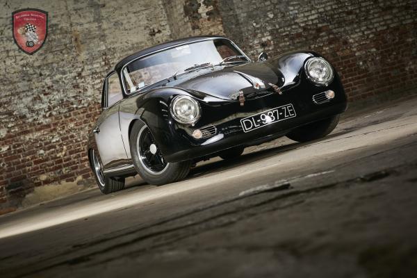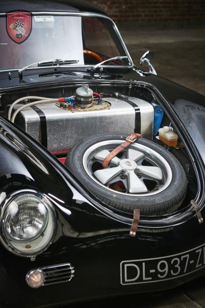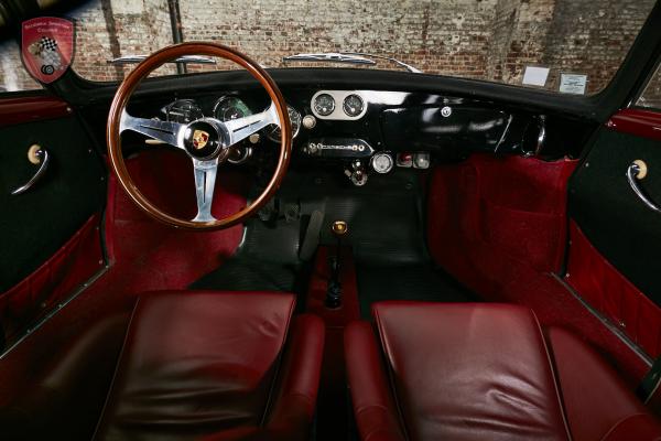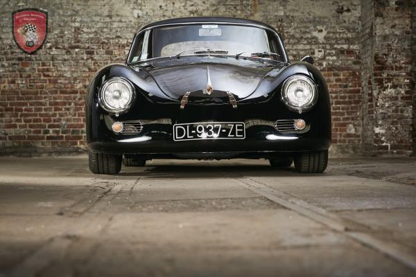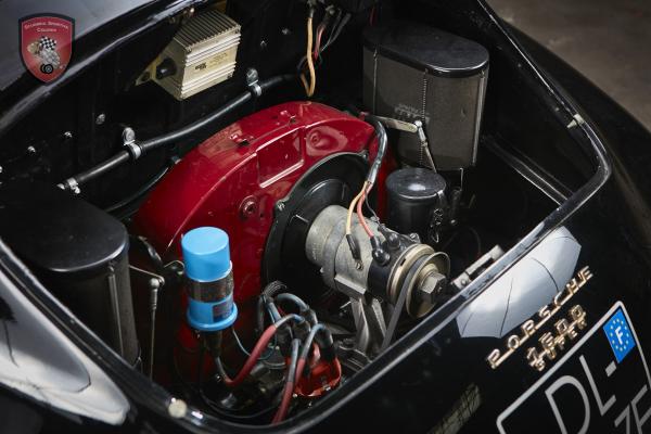 Dieser Sportwagen wurde erstausgeliefert in die USA. Da schon die 356 B Modelle in den Startlöchern standen, hatten es die letzten 356 A schwer noch verkauft zu werden. Also wurden schon seiner Zeit diese Fahrzeuge modifiziert und getunt und als „outlaw“ verkauft. Dem hier angebotenen 356 A widerfuhr das gleiche Schicksal und mündete schon in den 70er Jahren in einen radikalen Umbau des Gründers und Porsche Spezialisten Hank Gottfredson, Inhaber der GT Racing in Colorado Springs. Den Motor steuerte der legendäre Motorenbauer Duane Spencer, Autor des "Porsche 356 Performance Handbuch“, bei. Es handelt sich dabei um einen modifizierten 1.720 ccm Motor mit Weber Doppelvergaser, geschaltet von einem Renn-Getriebe-Cluster (BBAA, wie pro GS Carrera Speedster und 550 Spyder Spezifikation) Der rote Drehzahlmesser beginnt erst bei 7000 U/min. Weitere Extras wurden verbaut wie 993 Ölkühler und Stahlflexleitungen für Öl- und Bremsleitungen. Scheibenbremsen vorne + hinten, ein doppelter Hauptbremszylinder, Renntank mit Elektrik Six-Volt Kraftstoffpumpe. Weiter ist ein Öl- und Kraftstoff-Manometer verbaut sowie eine Kraftstoff-Druckregler-Ergänzung in den Motorraum. Außen gehört ferner eine modifizierte Karbon-Motorhaube mit Lederriemen, Kohlefaser Seitenspiegel sowie die Sechs-Zoll-Räder Fuchs passend zur Innenausstattung lackiert. Die Fenster wurden nach Maß aus Polycarbonat gefertigt, die Innenausstattung mit neuem, hochwertigem Leder bezogen und ein wunderschönes Nardi Lenkrad verbaut. Die Seitenfenster werden per Lederriemen verstellt, die hinteren Seiten und Heckscheibe sind aus Macrolon. Dieser 356 A ist somit konsequent und radikal gewichtsoptimiert. Seit 2015 ist dieser Sportwagen Bestandteil einer französischen Sammlung und hat dementsprechend französische Fahrzeugdokumente.